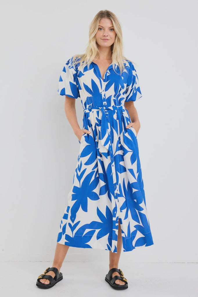 Dusk Puff Sleeve Maxi Dress - Bright Blue Abstract Among the Brave
