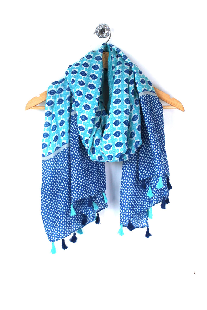 Tasselled Print Scarf w Diamond Border - Blue/Turquoise