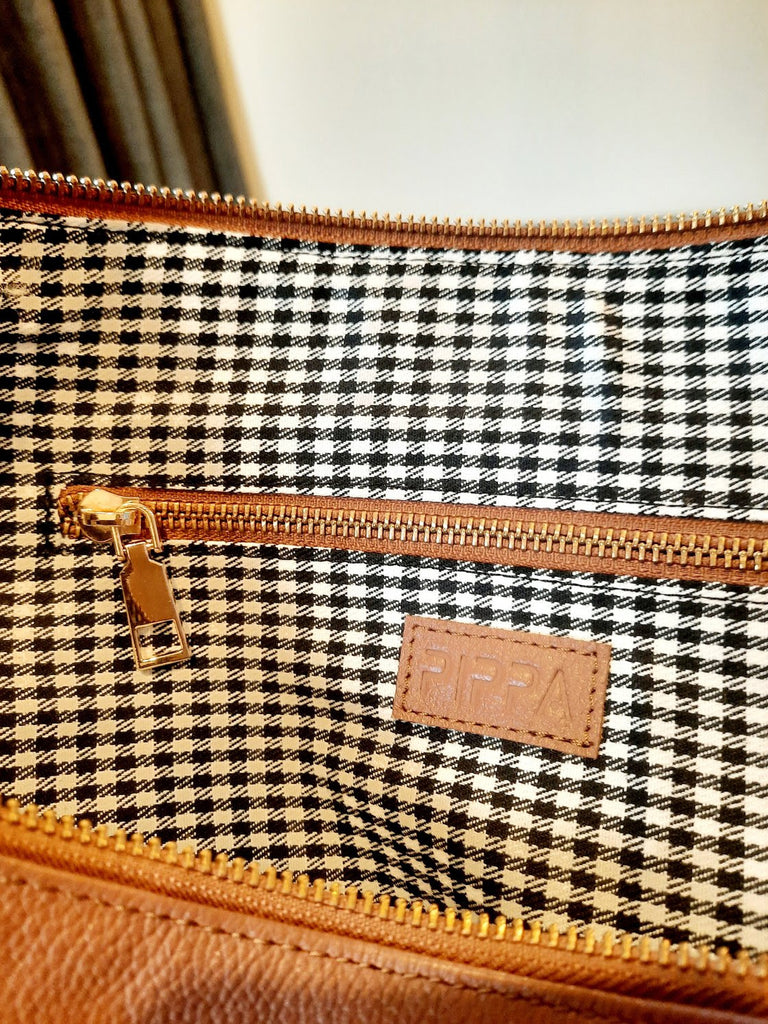 - Inside - 1 zipper pocket, a 3-slot pocket for sunglasses, reading glasses and phone and a cotton houndstooth printed lining