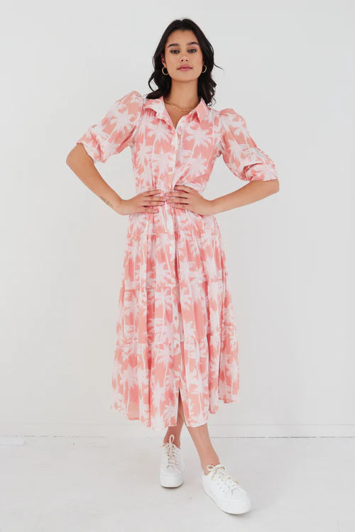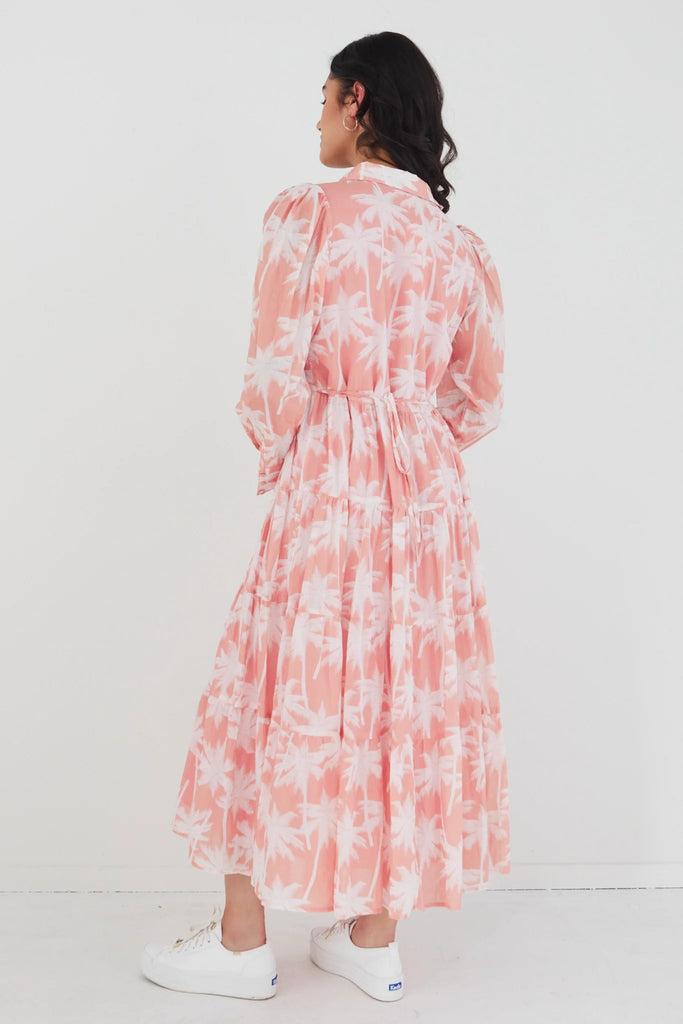 Adair Tiered Shirt Style Maxi Dress -Blush Palms