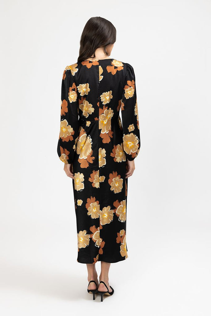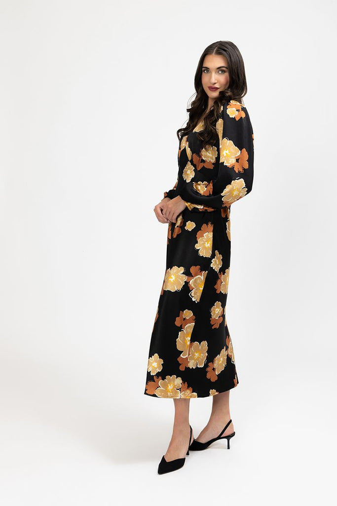 Lovely slim dress featuring a V neck, side zip, shaping & gathers under the bustline complete with long sleeves with elastic cuff.