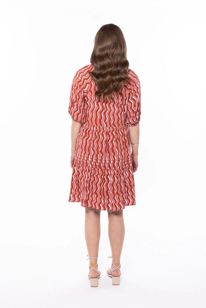 This lovely dress features raglan sleeve, split V neck with band, tiered skirt with pleating across middle tier. Lined from the waist down. A fun summer dress to wear anywhere