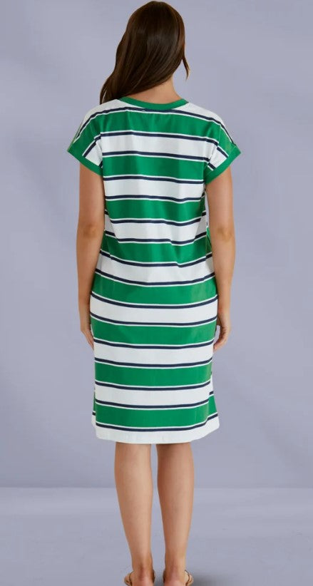The Zena T-Shirt Dress is a relaxed, easy-to-wear piece featuring a V-neckline and grown-on sleeves with turn-back cuffs. Knee length and equipped with pockets, it offers an elevated yet comfortable silhouette. A classic, effortless transeasonal dress designed for versatile styling.