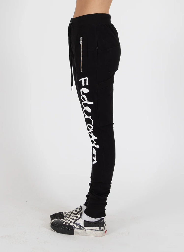 Introducing our much-loved slim-leg trackies in black and silver zips. With our crayon Federation design.