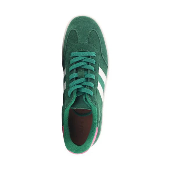 Sleek in profile this sneaker features a white-coloured rubber sole, striped white trim and a green suede leathered upper. A spin on a retro classic sneaker.