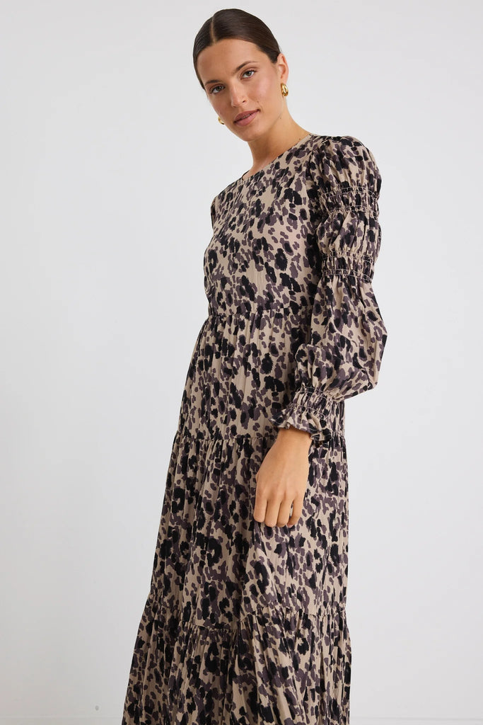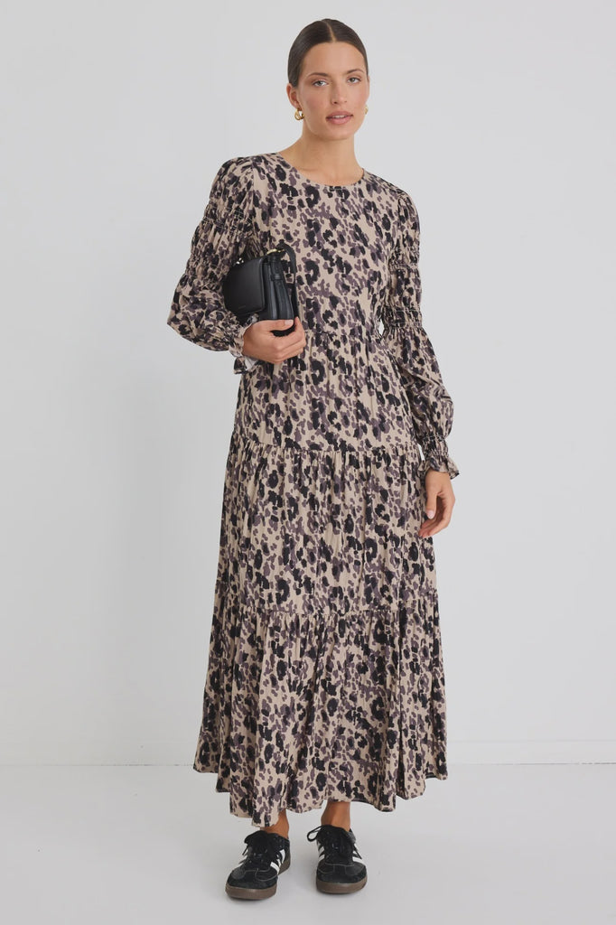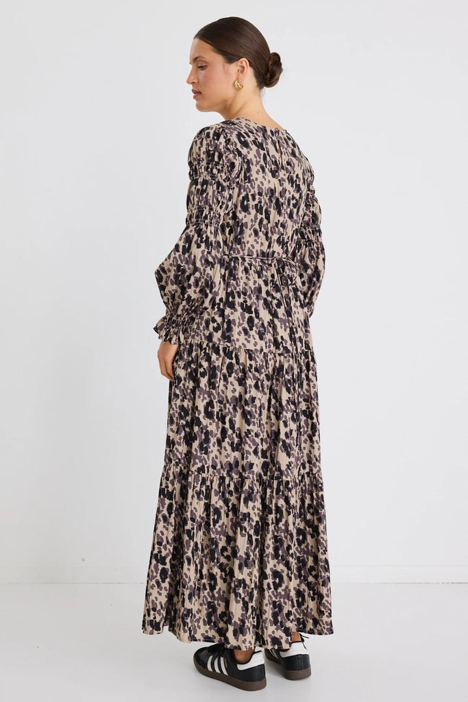 Effortless Animal LS Shirred Sleeve Tiered Maxi Dress - Animal