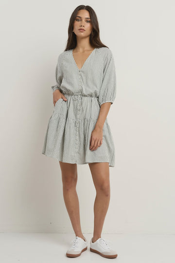The Switch mini dress features a flattering v-neckline, soft puff sleeves, and a cinched waist for that perfect shape. The fine khaki stripe adds a subtle touch of texture while keeping things timeless.