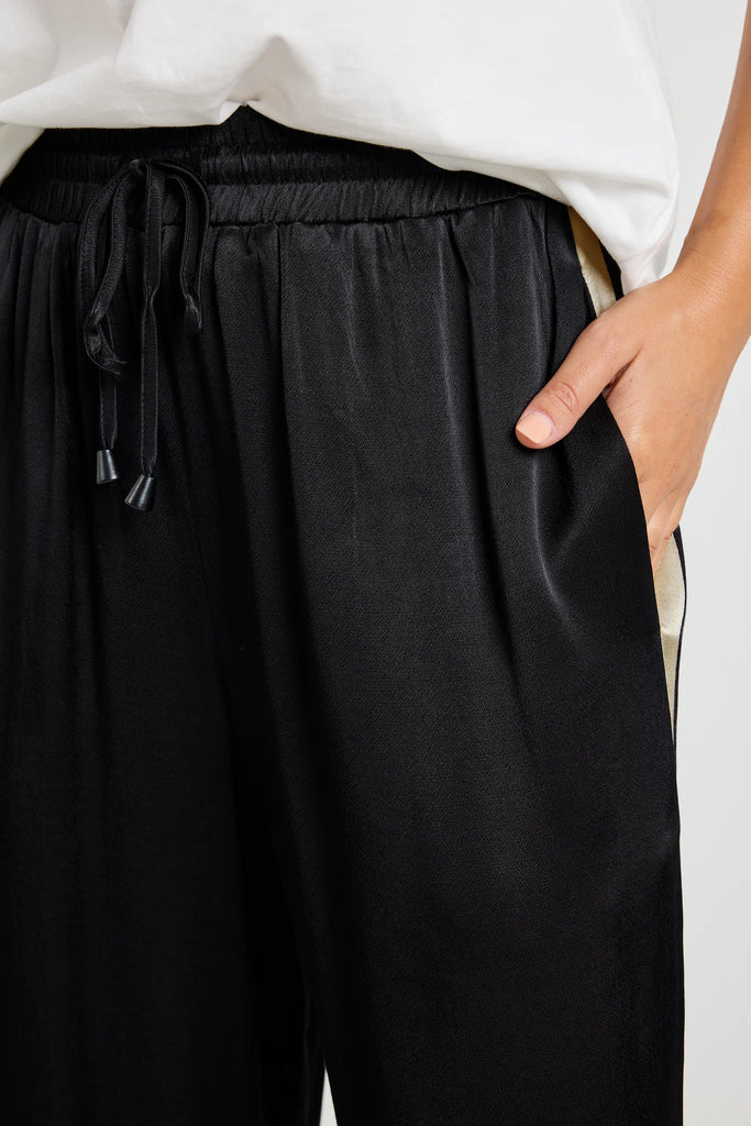 Upgrade your off-duty style with the Townie Black Satin Side Stripe Pants. Designed for ultimate comfort, these relaxed-fit pants feature a silky satin finish, an elasticated drawstring waist, and contrast white side stripes for a chic, athleisure-inspired look. Whether you're styling them with sneakers and a basic tee for casual days or dressing them up with heels and a blazer, these versatile pants bring effortless cool to any outfit.