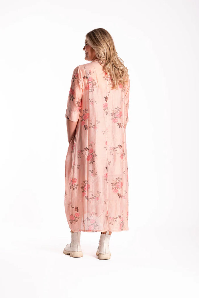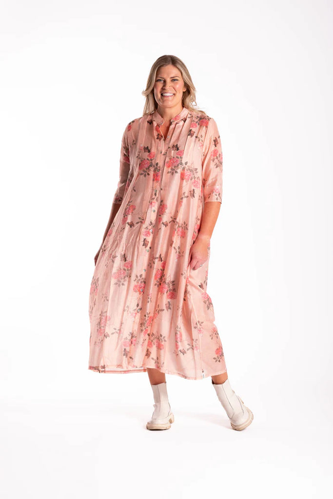 This dress is a wardrobe must this summer with its classic and timeless silhouette. The dress features, soft grandpa collar stand. With dart detailing at hem creating a beautiful voluminous tulip shape. Insert side pockets. Stitch detailing across the front body including pleat work. Wear simply with statement dress or style with a fitted tunic underneath and use it as a duster coat to finish your look.