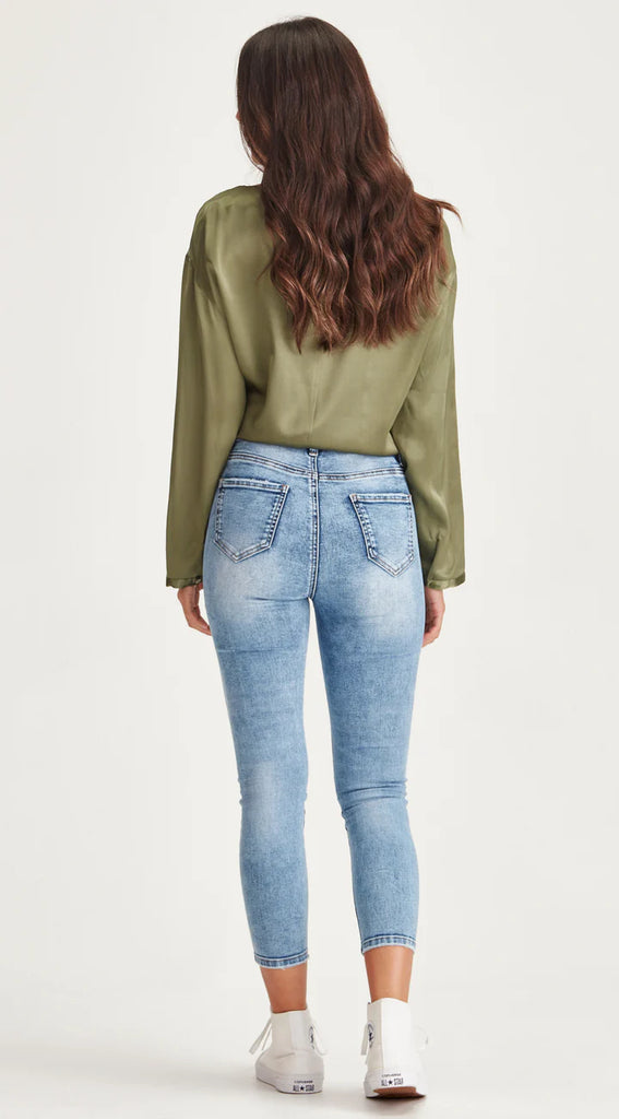 Mid/High waisted stretch denim skinny jean now in a shorter length.