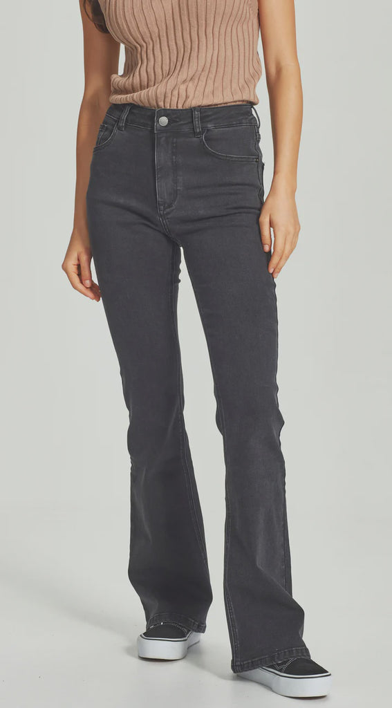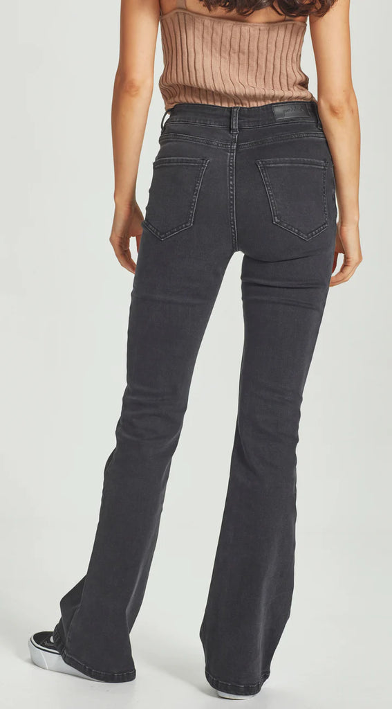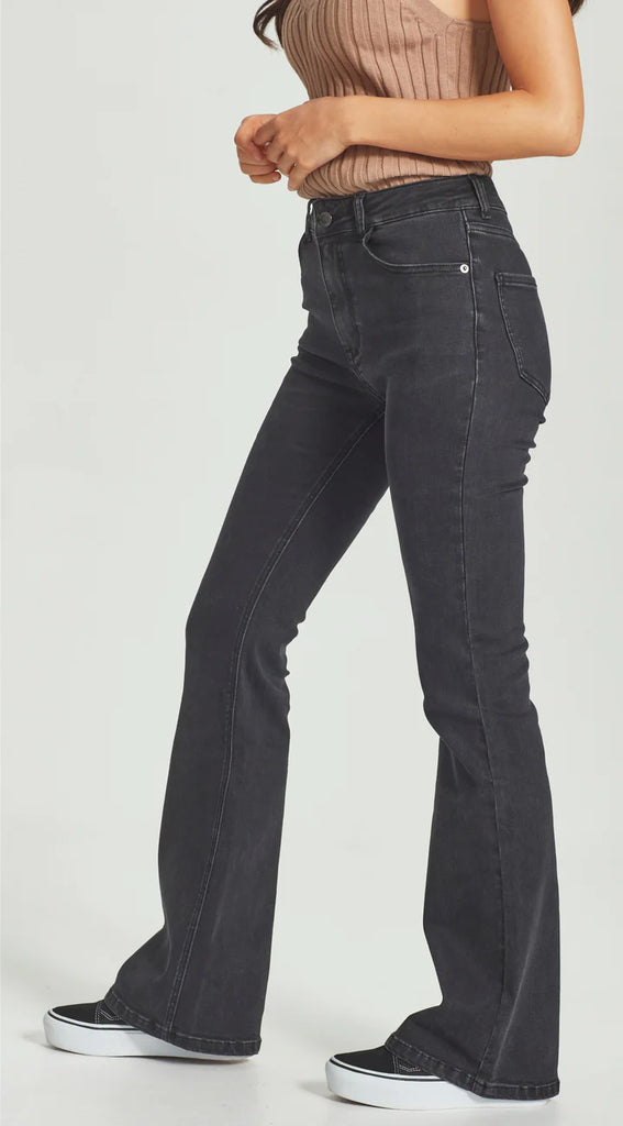 A classic flared jean in a soft stretch denim with a slim fit through the waist and thighs.