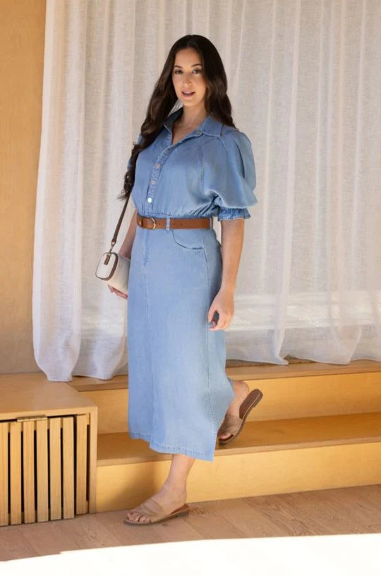 The Dual Dress offers a relaxed fit in lightweight Tencel with a denim-inspired look. Its balloon sleeves gather into elasticated cuffs for a feminine frill detail, while the waist is softly gathered to enhance the shape. Perfect for easy, stylish wear with subtle contrast stitching for a fresh touch.