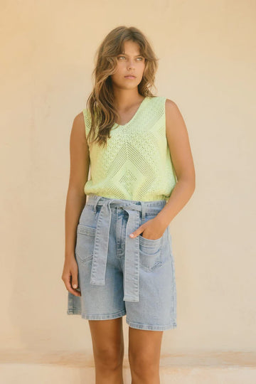 The Sylvie Top is a sleeveless knit with subtle texture and a flattering V-neckline. With a side split hem and diamond pattern finish, it blends structure with softness.