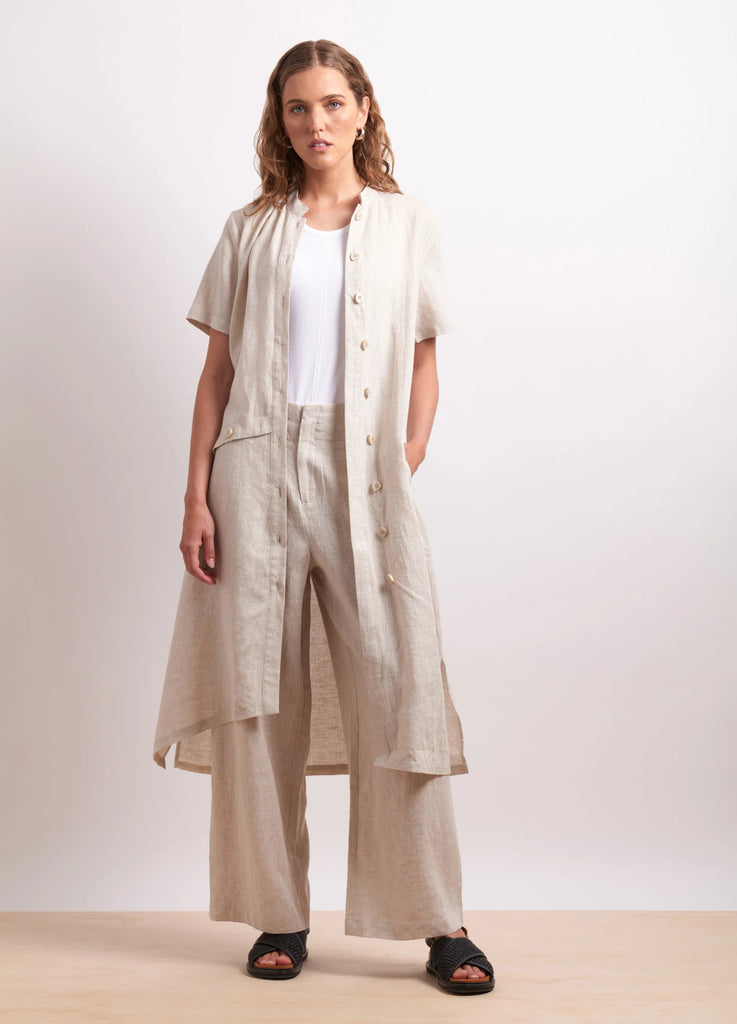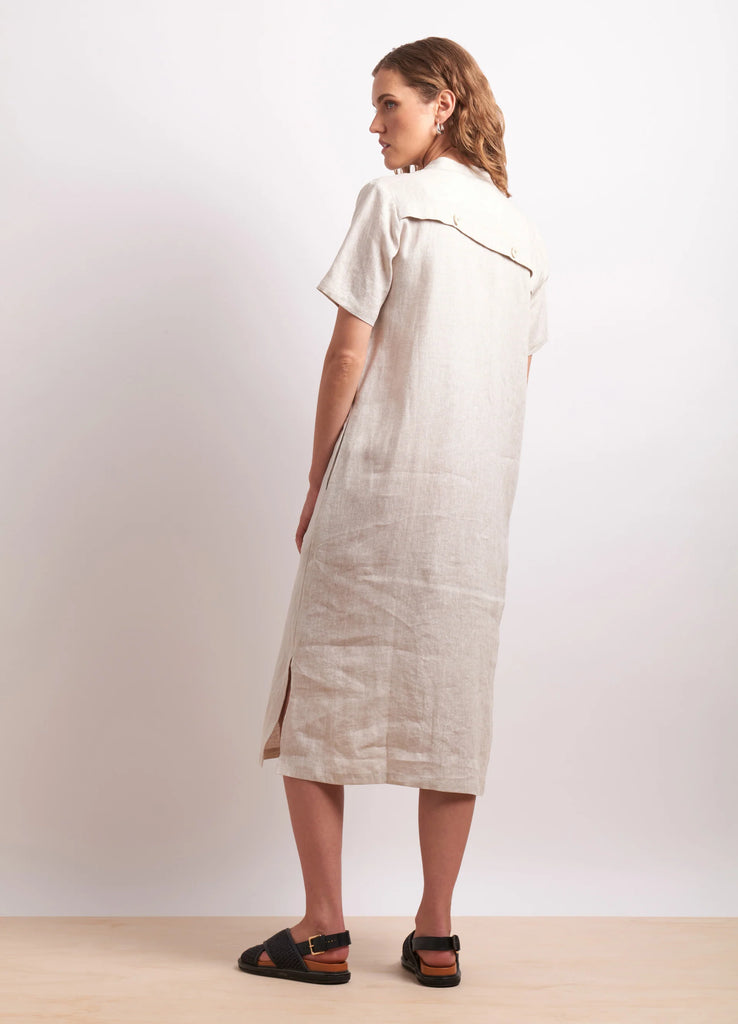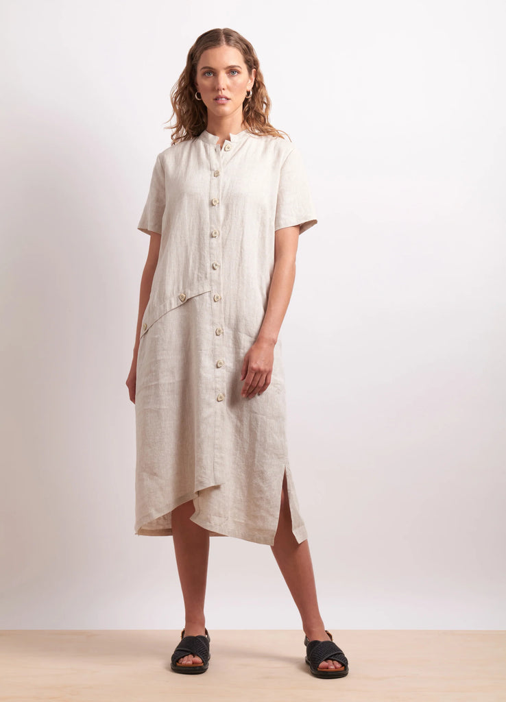 The Divine Angles Dress is a 100% linen midi dress designed with sculptural panelling, side splits, and tonal button detailing. It has a mandarin collar and pockets and can be worn as a dress or open as a duster.