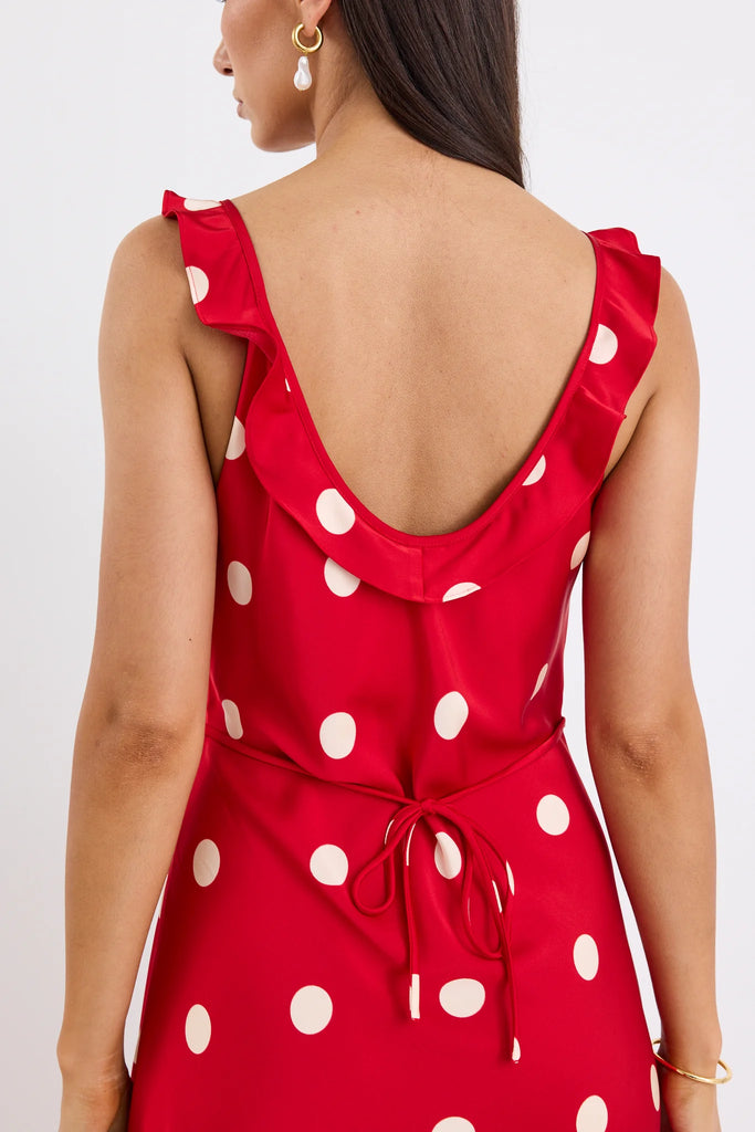 Delightful Satin Bias Maxi Dress - Cherry Polka Dot