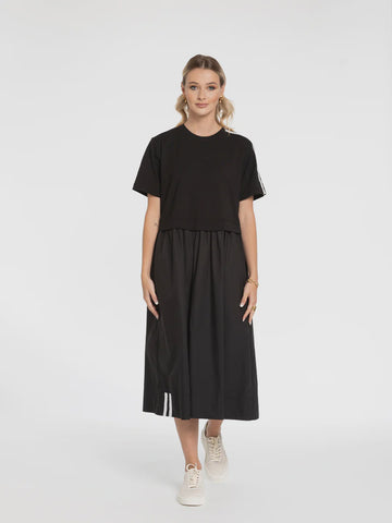 The That Way Dress is your go-to effortless midi for days when you want to look put-together with minimal fuss. Its cotton blend fabric holds its shape while offering a touch of stretch for all-day comfort, and the bold contrast trim along the neckline and sleeves adds a graphic finish that instantly elevates any look. The slim-fitting bodice softly flares into a gentle A-line skirt hitting just below the knee and features discreet side pockets for practicality without sacrificing style.