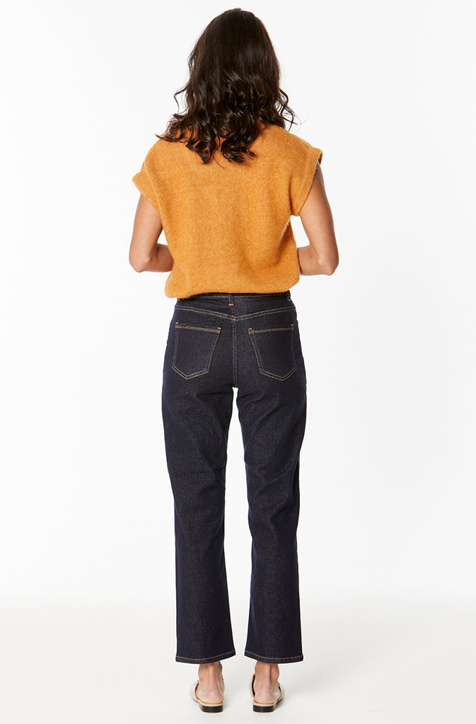 COMBE H WASH – 75% Cotton 23% Polyester 2% Spandex – Retro never looked better than this high rise ankle grazer straight leg jean. Smart dark wash denim. 29cm rise. 28inch inseam. 40cm around hem.