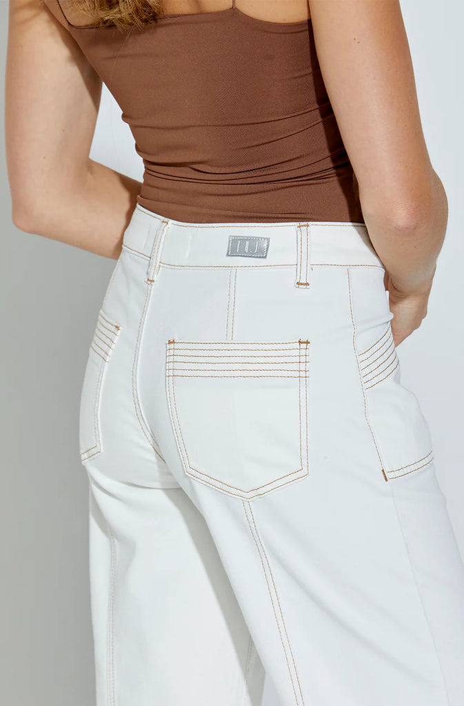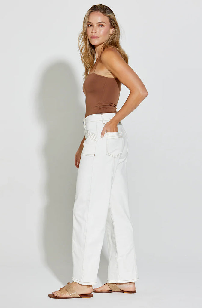 97% Cotton 3% Spandex – Elevate any outfit with these wide leg ankle grazer jeans. This on trend style features seam detailing in tan on the pockets and down the middle of the front and back leg elongating the leg length. 27cm rise. 29inch inseam.