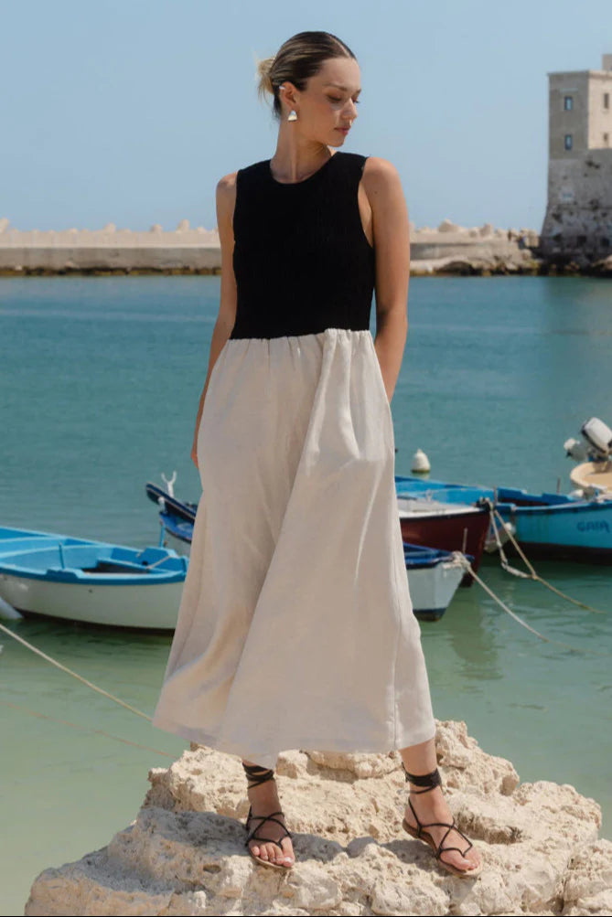 The Bryar dress is that dreamy blend of texture and shape, with a shirred black bodice that hugs just right and a full ecru skirt that flows effortlessly. Crafted from a breathable blend of linen and viscose, it offers a light, natural feel that’s perfect for any occasion casual or elevated. It’s minimal, modern, and endlessly wearable.