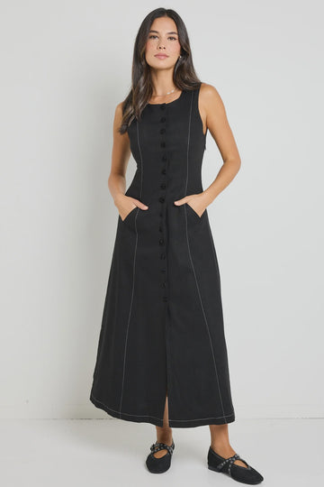 The perfect dress to feel put together immediately, the Guide Black Maxi Vest Dress. The sleeveless, button-front design offers a sleek look with a touch of contrast stitching to give it that needed detail. Made with a comfortable blend of viscose and linen, this dress is also fully lined for added comfort.