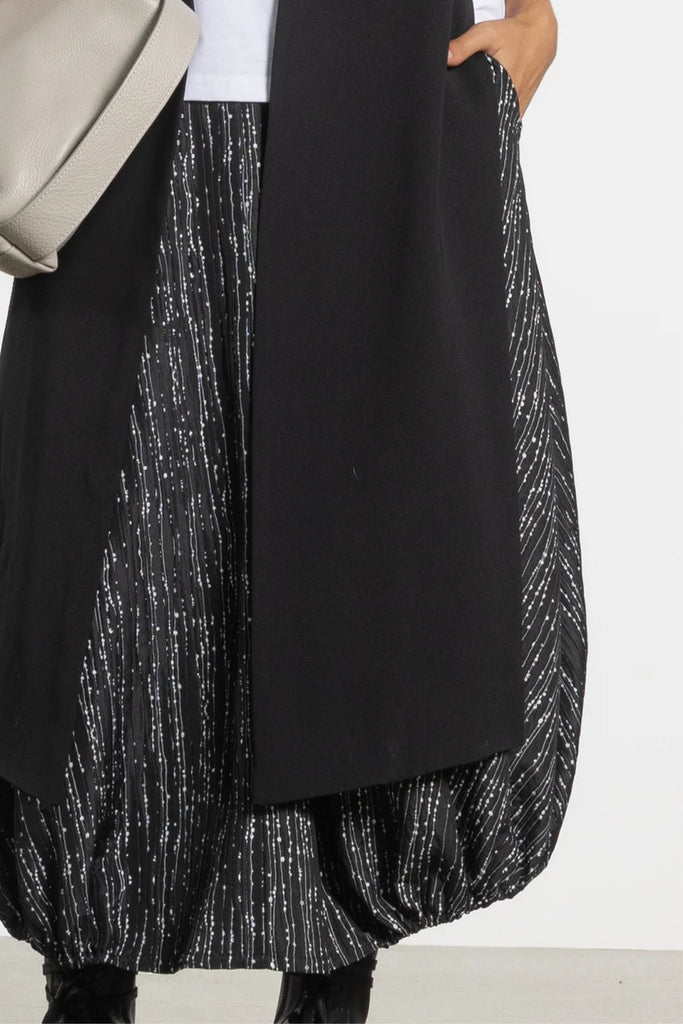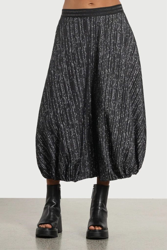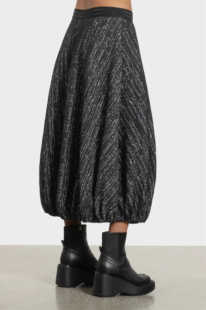 The Kane Skirt redefines structure with softness. Featuring a bubbled silhouette and intricate pleated and printed fabric inspired by falling teardrops, it moves with intention and ease. The elastic hem and waistband offer comfort, while functional pockets ensure practicality. Pair it with boots and a relaxed knit for a modern, architectural edge.