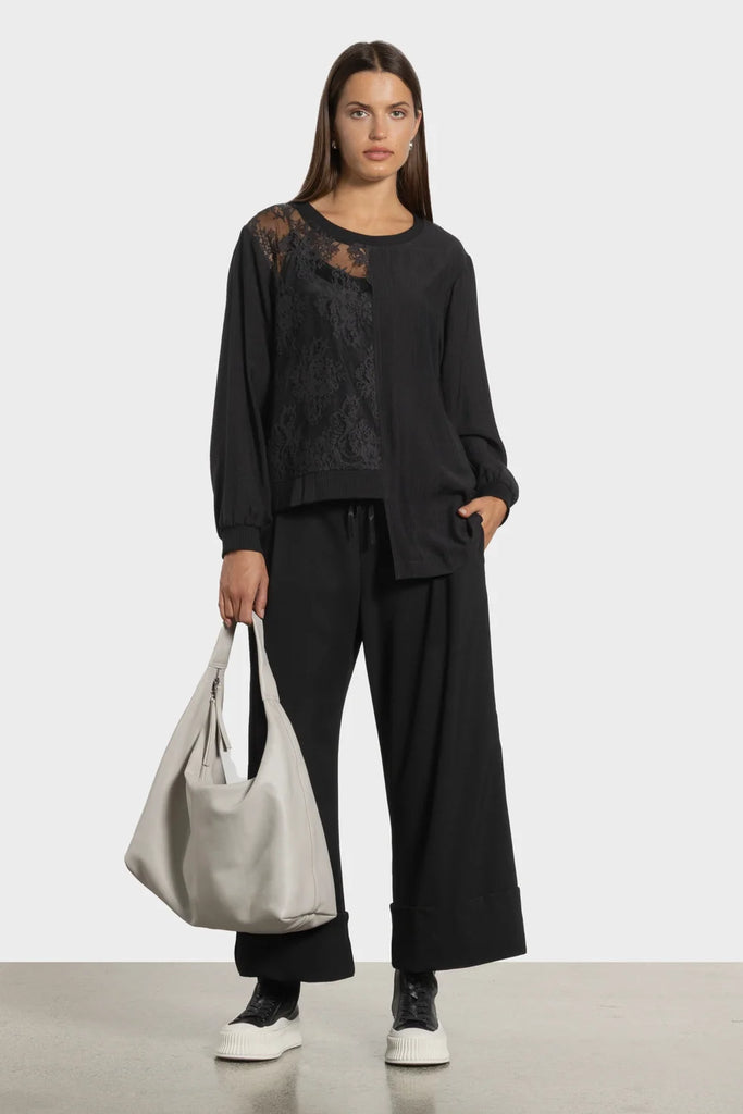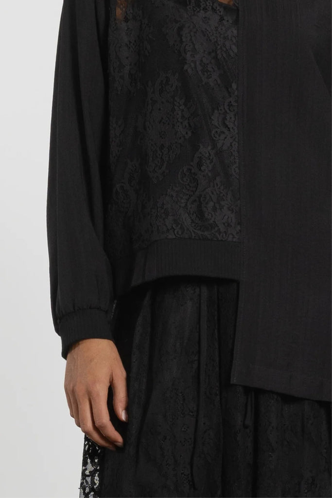 The Sigma Top blends romance and edge with its asymmetric design and half-lace construction. A ribbed neckline and cuffs add comfort and contrast, while the high-low hem brings relaxed movement. Layer it over wide-leg pants or under structured jackets for a textural twist on everyday dressing. A refined yet wearable piece that adds intrigue to your rotation.