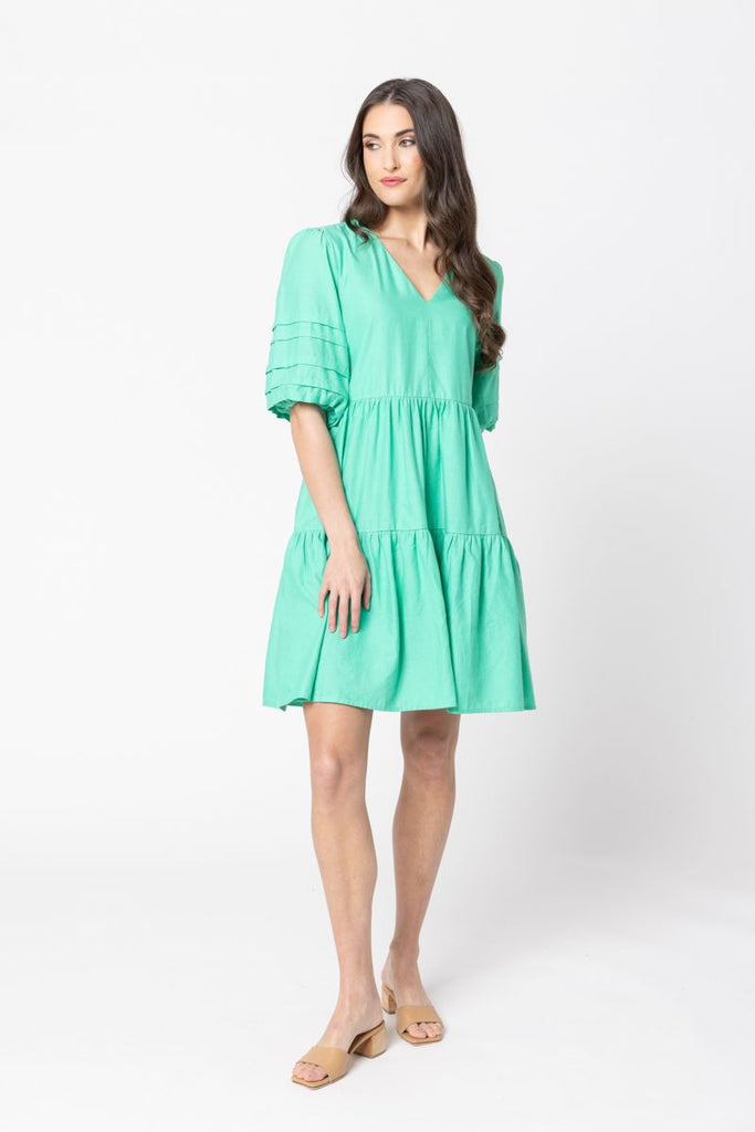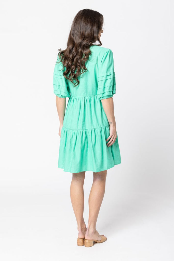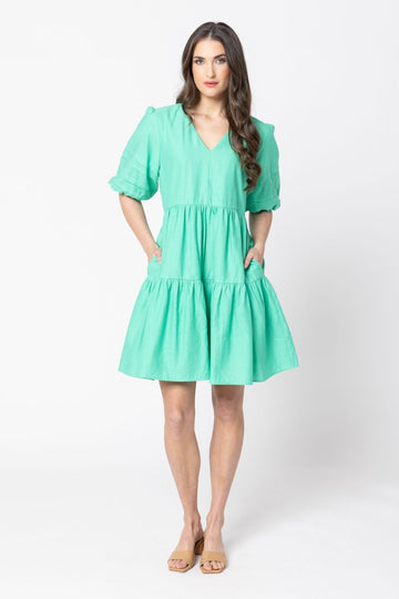 Playful yet chic, this apple-green dress is your go-to for easy elegance. The gathered tiers create soft movement with every step, while the puff sleeves add a touch of drama. Style it with sandals for daytime charm or elevate it with wedges and statement earrings for an evening out.