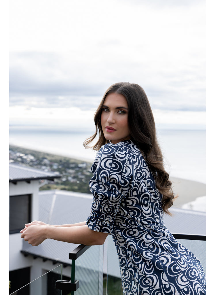 A Empire waist enhances the fluid fit of this figure-skimming midi made with a retro print and framed by puff sleeves.
