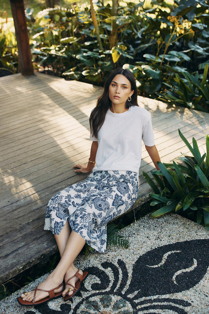 Wrap style skirt in a silk blend, featuring a unique ruching tie, with the underlayer fixed at the side seam for comfort. Featuring a side zip and elasticated back waist.