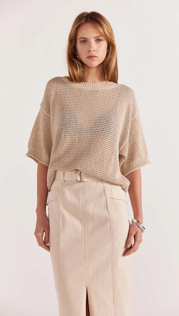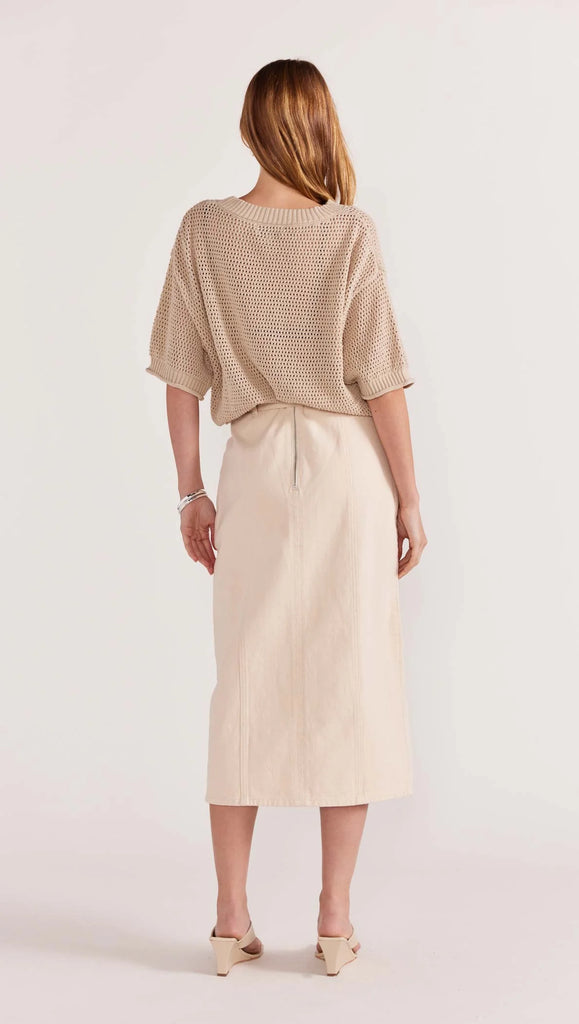 The Ines Denim Midi Skirt is the skirt that will never get old. Adding fresh neutral tones to your essential wardrobes is the instant win you can't go wrong with for seasons to come. Style with our natural toned Nora Open Knit Tee and nude heels or sandals for a all round neutral look.