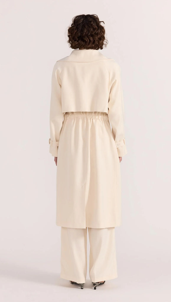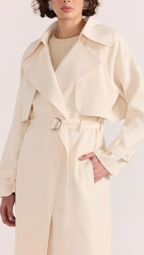 The Sabine Trench Coat is a timeless addition to any wardrobe. Featuring a relaxed silhouette, and neutral cream wash. Style yours with the matching Sabine Wide Leg Pants to complete the effortlessly chic look.