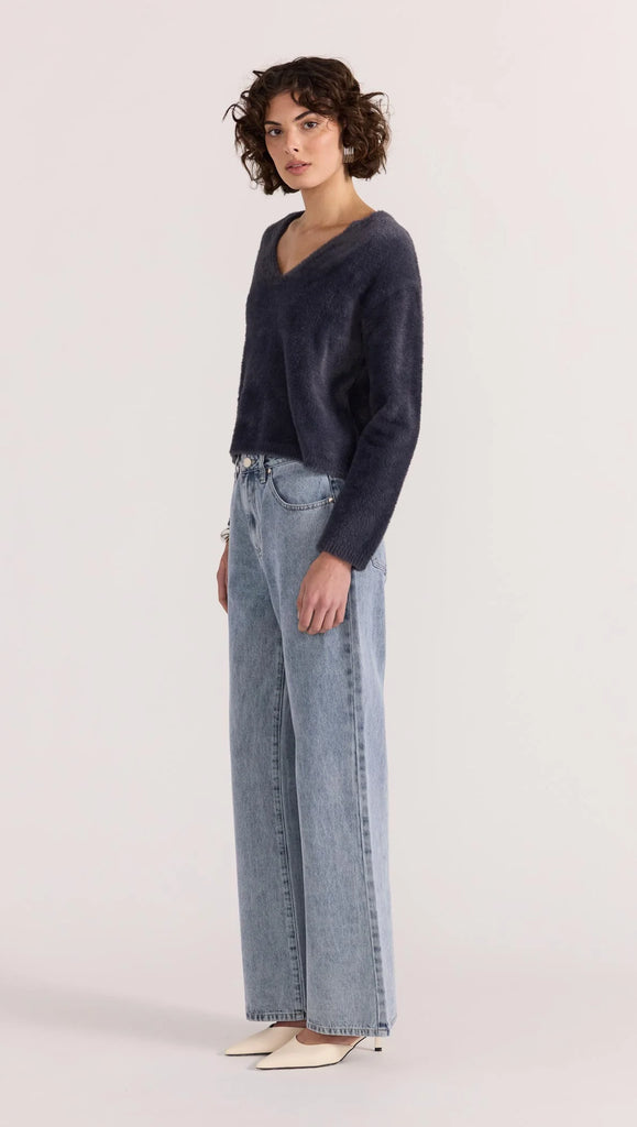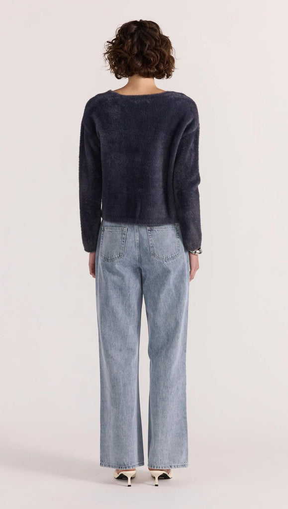 Soft to the touch and effortlessly wearable, the Ember Fluffy Knit Jumper is your go-to for cosy, elevated layering. This knit features a subtle sheen and plush hand-feel in a flattering slate hue. Designed with a relaxed fit and feminine V-neckline, the Ember Jumper offers a refined take on winter dressing—perfect for pairing with denim or layering over a slip dress for a textural contrast.