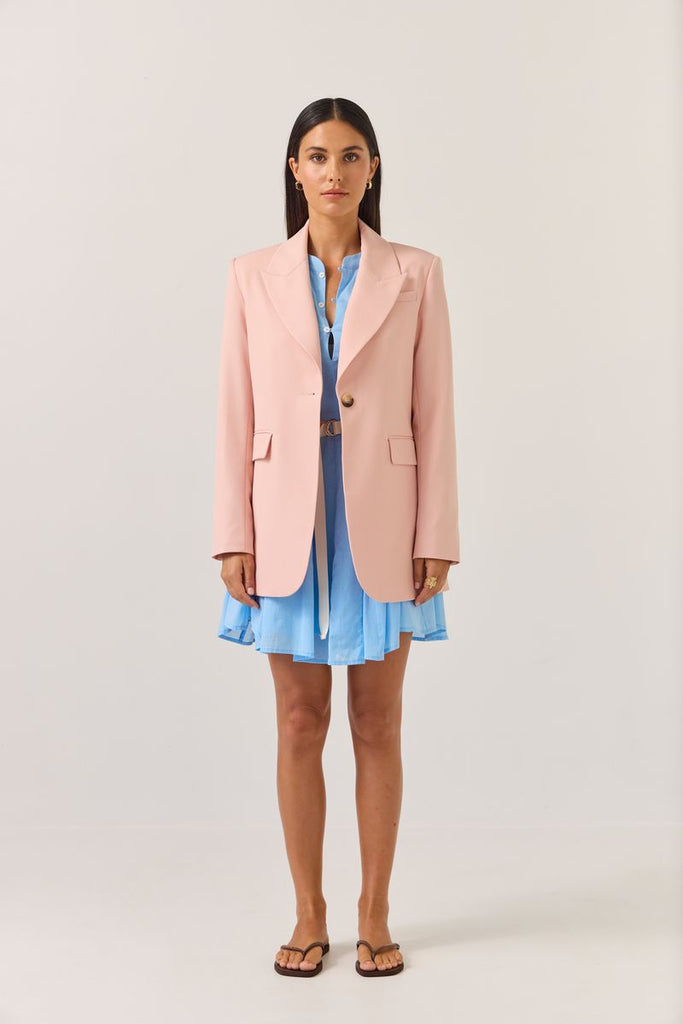 An incredible blazer shape, this tuxedo-lapel style is strikingly classic. Her sophisticated simplicity is anything but simple, with the quality of tailoring truly stunning. In new-season ‘millennial pink’ she works back with everything – whether layered over dresses or elevating a simple jeans & tee outfit. Seek out the matching Goldie Mini Skirt or Court Shorts for chic summer suiting vibes.