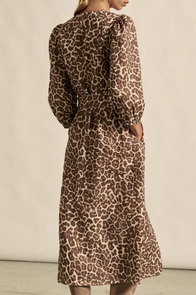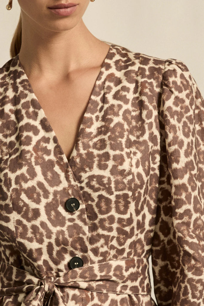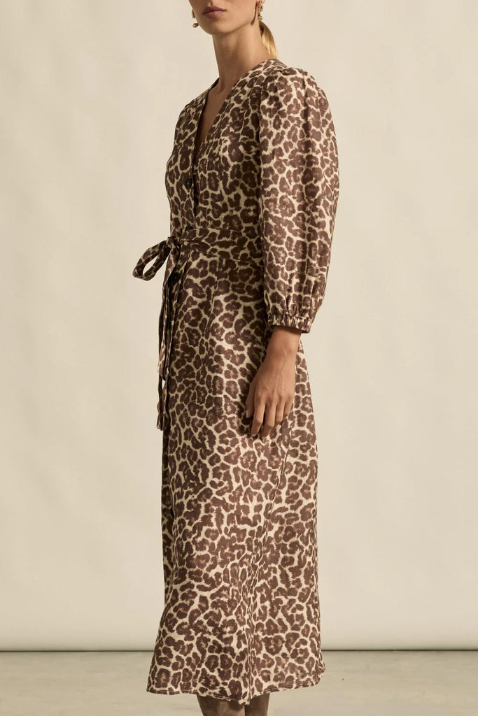 A modern interpretation of the leopard trend, the verge Dress in ocelot offers a neutral, wearable take on animal print. The button-through detail and V-neckline create a refined silhouette, while softly gathered sleeves and A line create a modern and flattering aesthetic. see product details below.