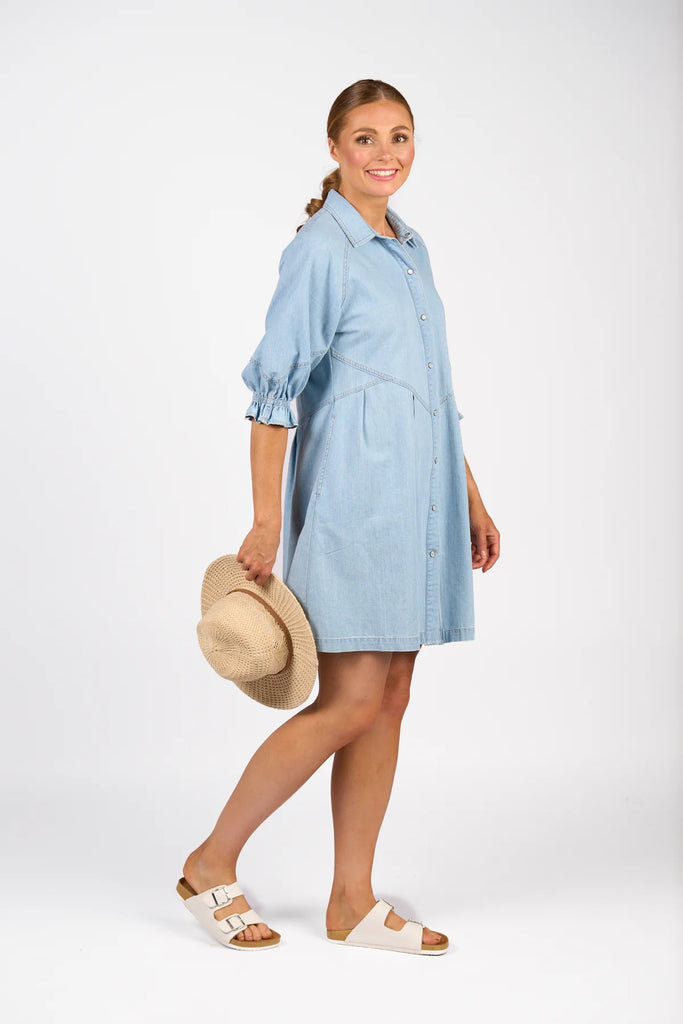The Piper Dress in Light Wash is made from a lightweight 100% cotton fabric with a denim look. It features mid-length raglan sleeves with elasticated cuffs, a popper front, and subtle pleated seam details that add shape to its relaxed fit. Side pockets complete this versatile, casual dress perfect for everyday wear.