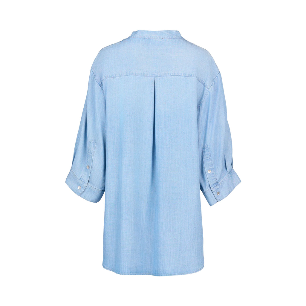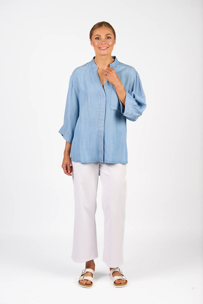 The Holiday Shirt is a loose-fitting summer essential made from lightweight tencel fabric. It features a relaxed V-neck with a flat mandarin collar and 3/4 length sleeves with button cuffs. Designed for easy layering, its deep curved hem and side splits create effortless movement and breezy comfort.