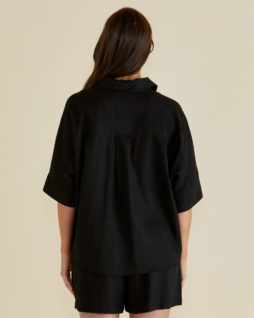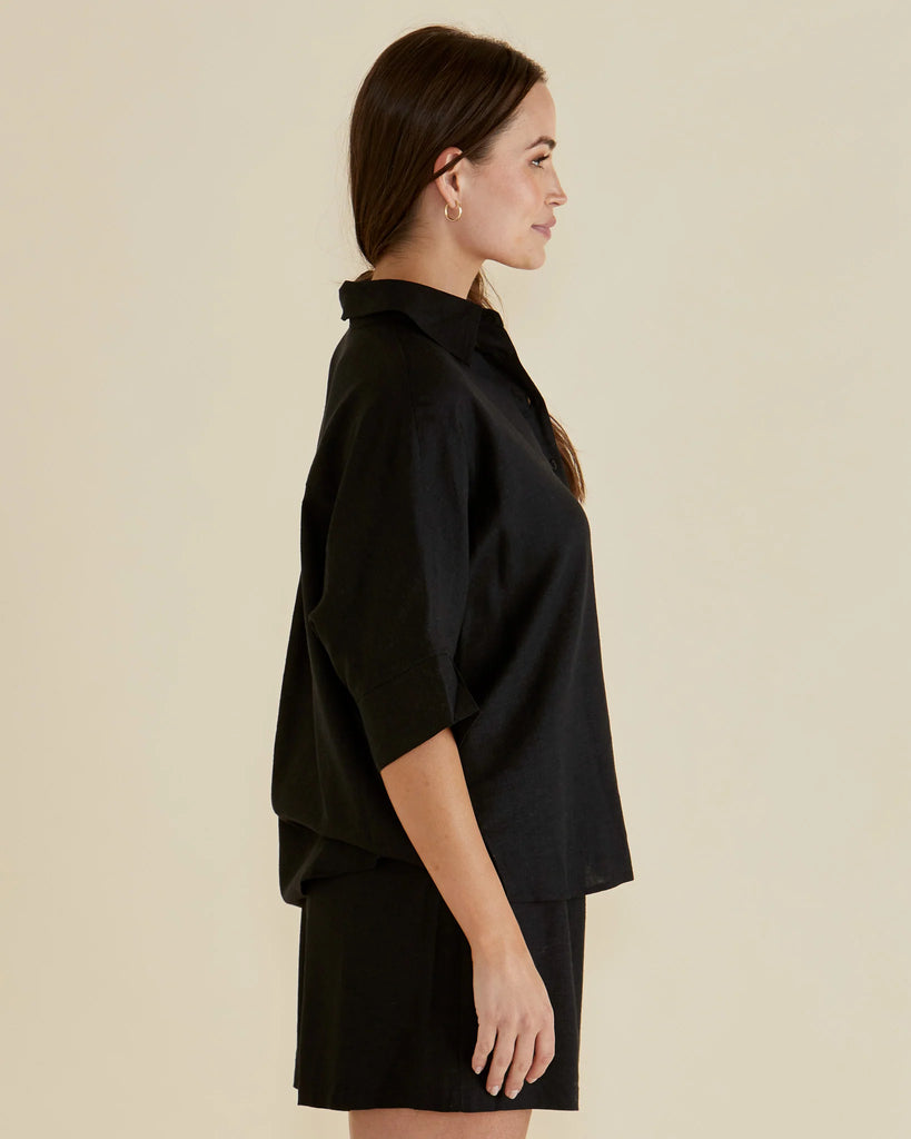 The Lynwood Linen Shirt is an oversized classic crafted from a breathable viscose/linen blend. Button-up front with collar and extended split cuffs elevate this relaxed fit essential. The high-low curved hem adds effortless style, making it a perfect transeasonal layering piece that is comfortable and polished.