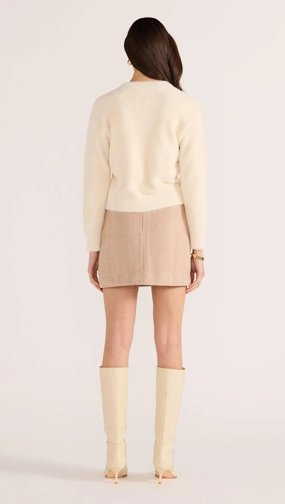 The Rowan Fluffy Cardi in ivory is cozy, feminine, and effortlessly refined. Made from a super-soft, brushed knit, this timeless button-up cardigan brings a luxe texture to your wardrobe while keeping things relaxed and wearable. Perfect over a slip dress, paired with denim, or styled with the Audrey Herringbone Mini Skirt for a contrast of texture and polish.