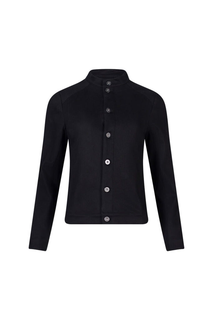 Button-through slim fitting cotton jacket with a low collar stand, featuring ponte contrast panels. Fully lined.