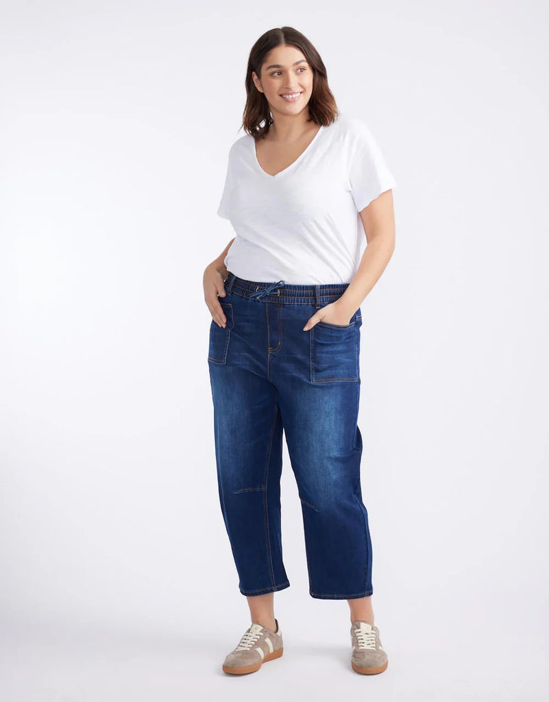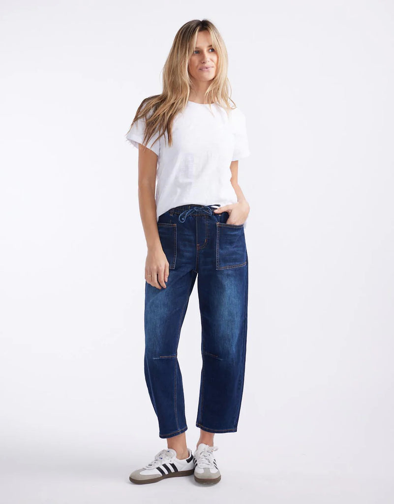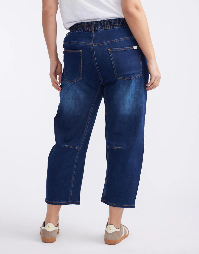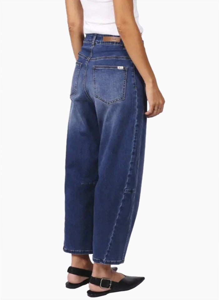 Characteristics of Leo Barrel-Leg Jeans include a fitted waist, flared-out shape around the mid-leg, and tapered silhouette at the bottom, which exudes the look of, well, a barrel. It's the vibe of a cowboy ready for a showdown in the Wild, Wild West!!!