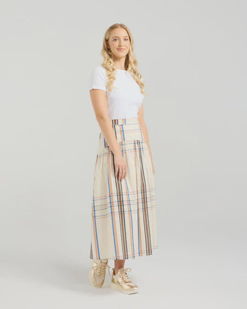 Twirl-worthy and totally flattering, this mid-length gathered skirt is all about easy elegance. The wide waistband smooths across the stomach for a comfy, cinched-in look, while hidden pockets add a touch of practical magic. Dress it up or keep it casual—this skirt is ready to go wherever your day takes you!